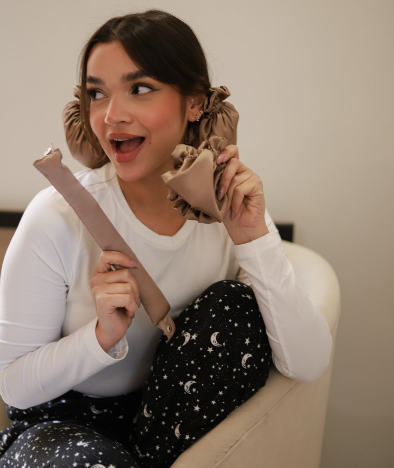 منتجنا "Zero Heat" Bun-Bons مصنوع من أفخم أقمشة "Peau De Soie" لمساعدتك في تحقيق الكيرلي لامعة وخالية من التجعد دون استخدام حرارة. يعتمد وضع البون-بونز بالكامل على تفضيلاتك الشخصية، مما يجعله خيارًا مثاليًا لتصفيف الشعر بدون حرارة لمحبي النوم على الجانب!